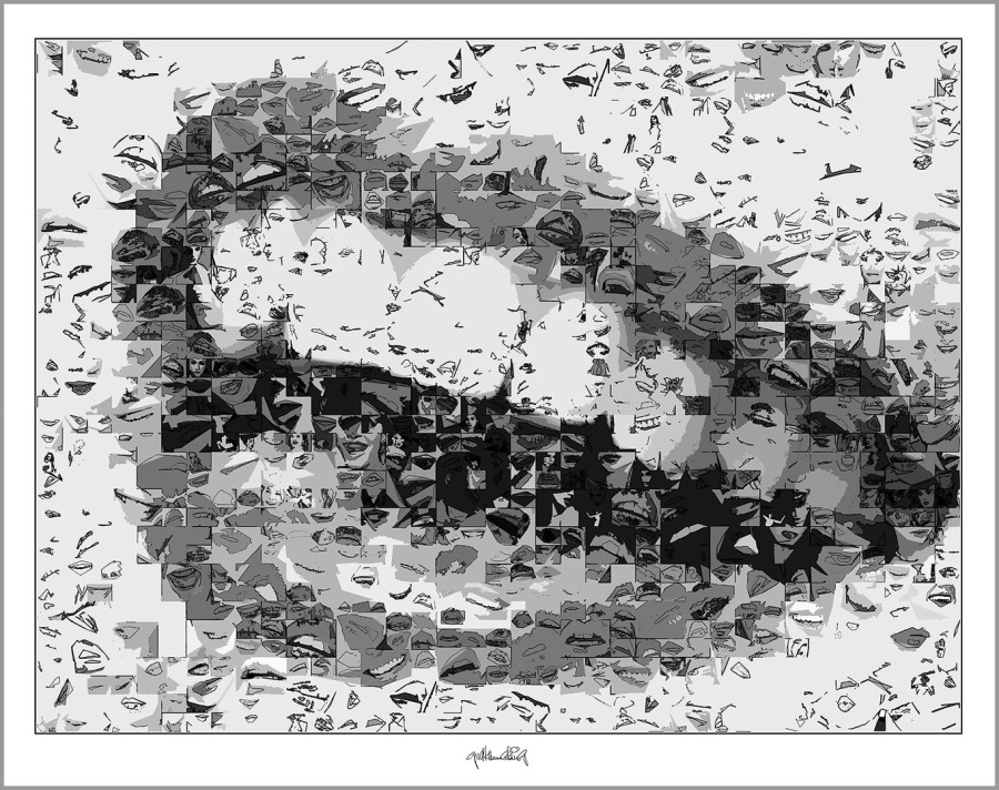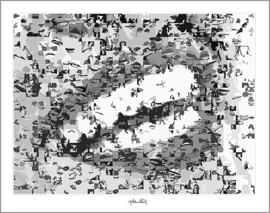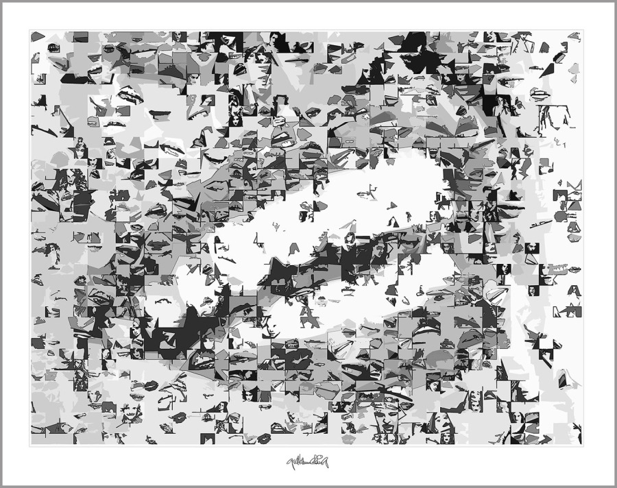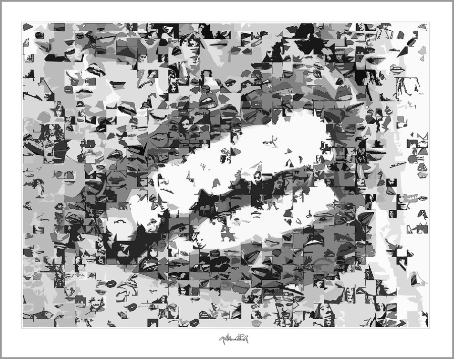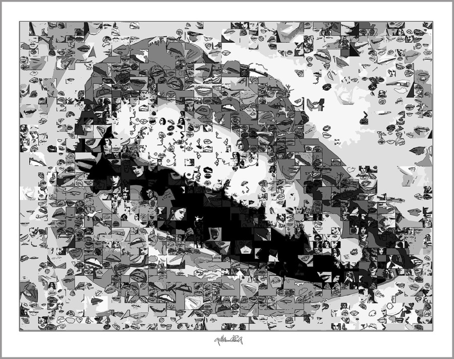 Durch hunderte Bildfragmente entstehen Kompositionen mit Bewegung, Tiefe und einer fast vibrierenden Spannung. Mit solchen schwarz/weiss Umsetzungen in den Wandbildern prägt man bewusst einen Raum! Sie finden ihren Platz überall da wo schwarz/weiss Ästhetik, Identität und passender Möbel-Stil wichtig sind – nicht in jeder, aber in so mancher Zahnarztpraxis.
