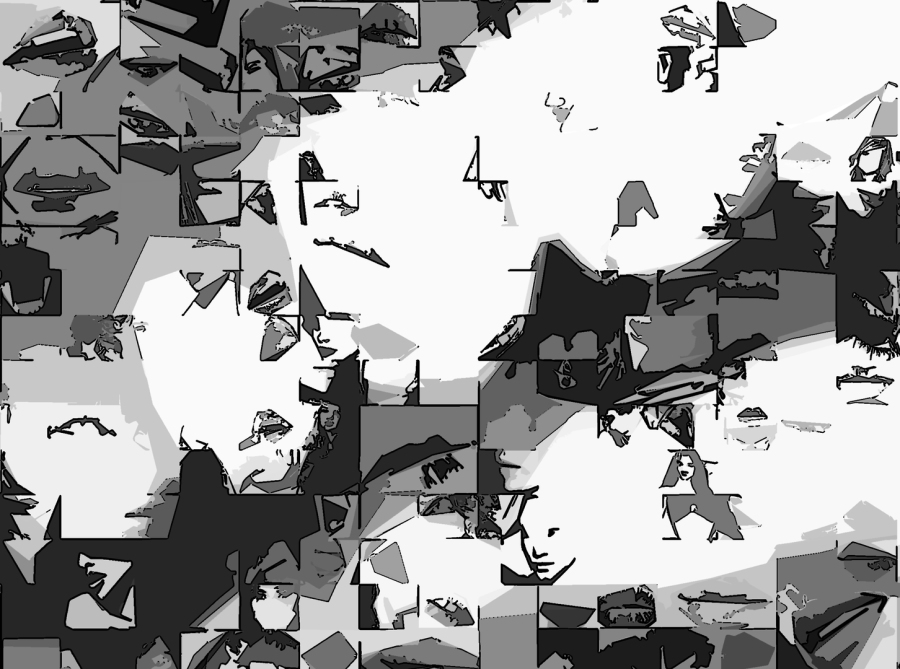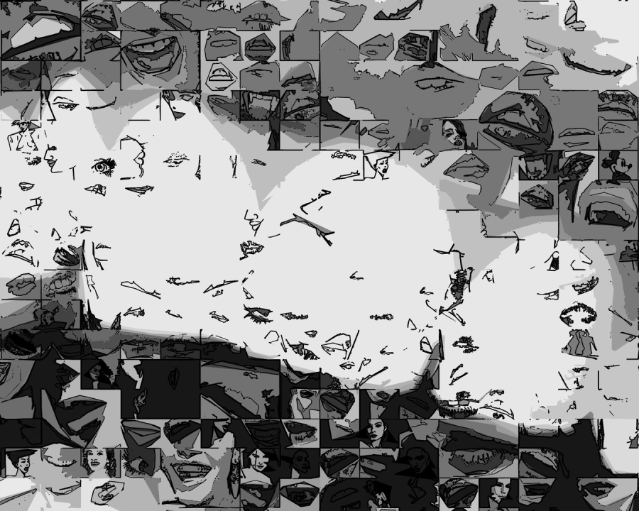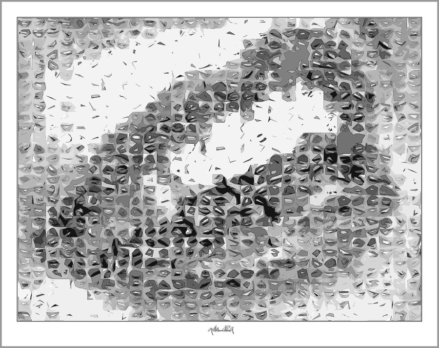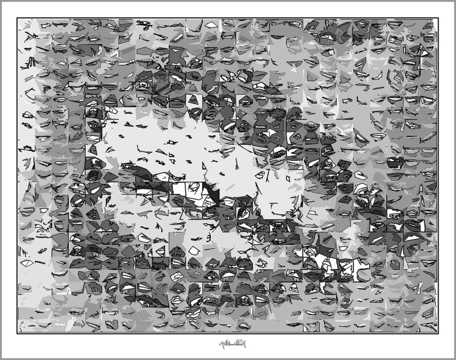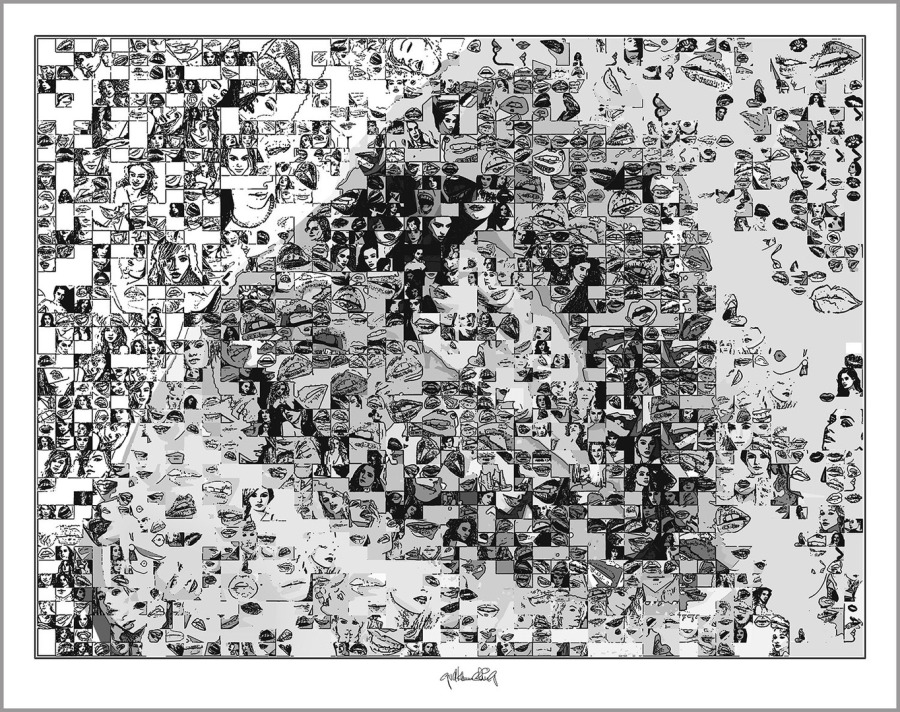 Durch hunderte Bildfragmente entstehen Kompositionen mit Bewegung, Tiefe und einer fast vibrierenden Spannung. Mit solchen schwarz/weiss Umsetzungen in den Wandbildern prägt man bewusst einen Raum! Sie finden ihren Platz überall da wo schwarz/weiss Ästhetik, Identität und passender Möbel-Stil wichtig sind – nicht in jeder, aber in so mancher Zahnarztpraxis.