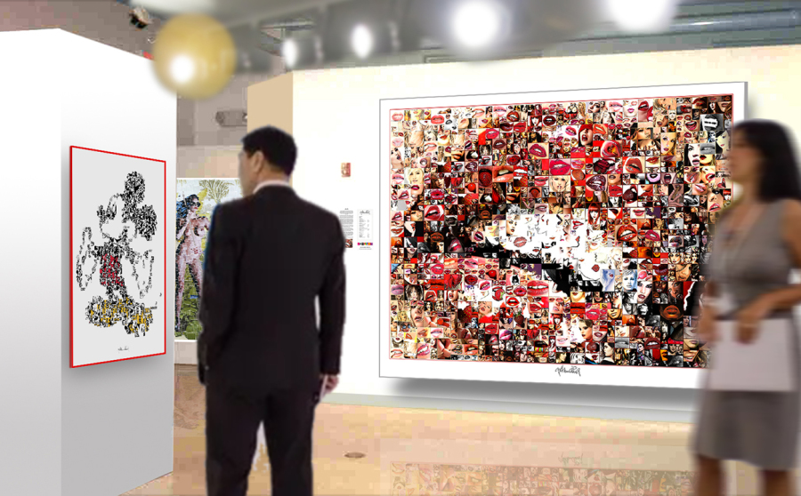 Wandbilder, die zugleich vertraulich und bildmächtig wirken. Seine Werke bestehen aus hunderten, individuell verfremdeten Bildelementen, die sich zu einem harmonischen Gesamtausdruck fügen. Es ist