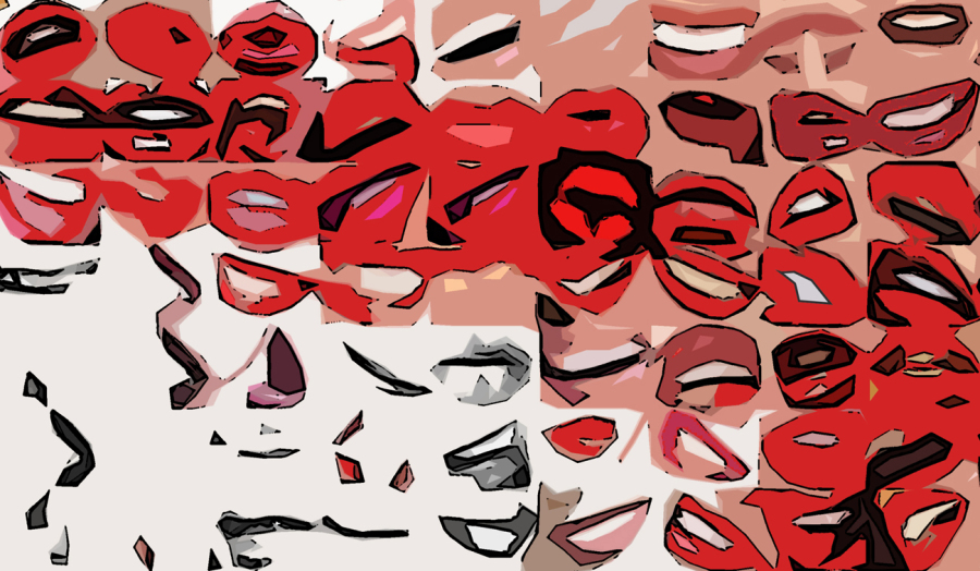 Stellen Sie sich vor: ein großformatiges Wandbild mit roten, abstrahierten Lippen und Fragmenten, erleuchtet mit weißem Licht auf einer