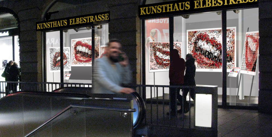 großformatigen Kompositionen leben von Rhythmus, Spannung und farblicher Präzision. Rote Lippen, grafische Strukturen und abstrahierte Fragmente ergeben ein ästhetisches Gesamtbild, das gleichermaßen